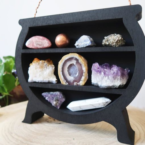 Made out of poplar wood and stained in a matt black colour this shelf is a perfect home for your crystals and has been finished off with a copper handle to the top!