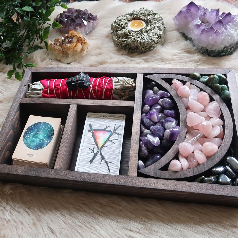 The display box has three main compartments, one for something long such as a sage smudge, two compartments underneath for either two tarot style decks or another space to store crystals and a moon with storage around it for crystals, trinkets or jewellery!