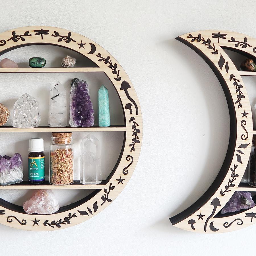 These shelves are perfect to display crystals with inner shelves that are just under 1 inch deep for your crystals to sit on, please make sure you measure your crystals before purchasing to make sure they will fit, the very small crescent moons on the end are for your tumble stones or very small crystals.