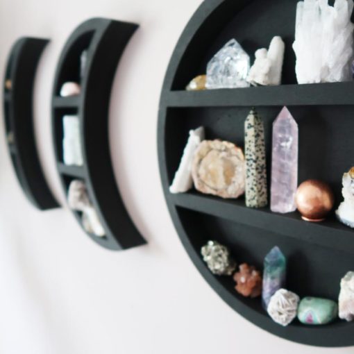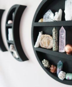 Made out of Poplar wood and stained in a matt black. Enjoy making a mystical space for your crystals on these real eye catching and statement pieces for your home.